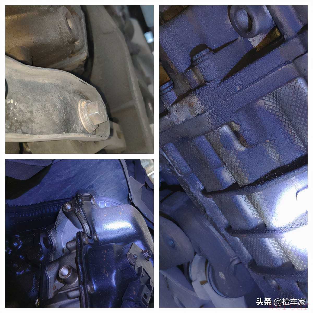 发动机下端的机脚固定螺丝没有拆卸拧动,结合此前的一些情况可以排除掉,发动机有过维修吊装的可能,发动机油底壳,固定螺丝没有拆卸拧动痕迹,但是目前渗油严重,需要后期进行处理,整个底盘渗油的部分比较多,包括变速箱壳体以及发动机正时盖。