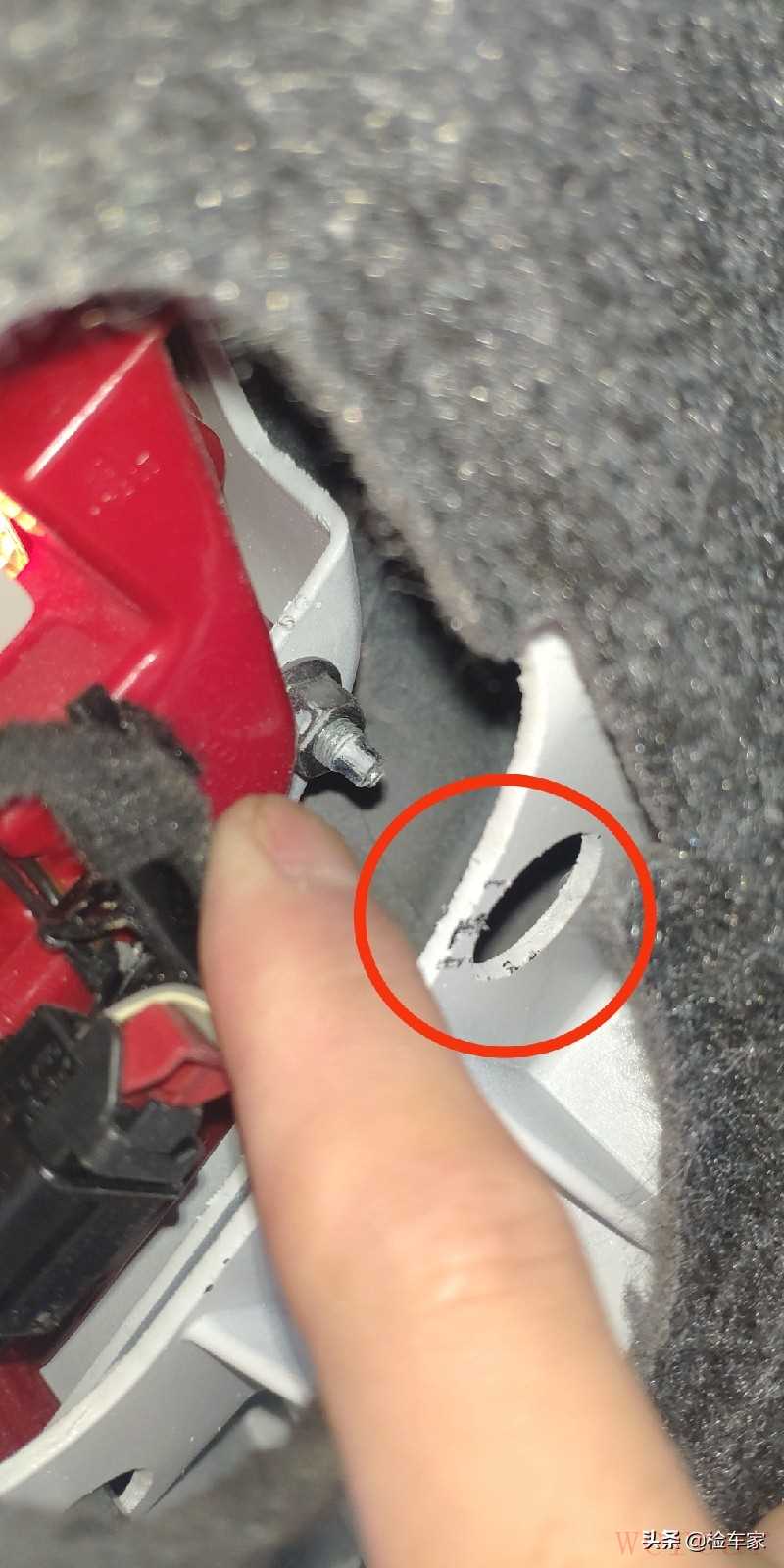 从上图可以直观地看出,该车后保险杠与雷达探头结合处有飞漆且固定螺丝有过拆卸,看来这车后面遭受的撞击事故还挺严重。