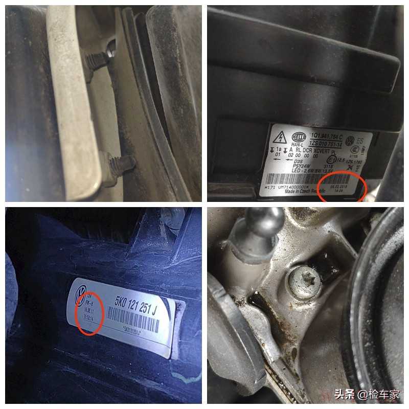 外观检测告一段落,接下来看看发动机舱部分,前方的水箱框架固定螺丝没有拆卸,根部的螺杆上面也没有拧动掉漆的情况,左右大灯都有拆卸,右前大灯生产日期为18年二月份和车辆出厂日期不符,存在更换。前面的水箱生产日期和车辆出厂日期吻合,固定螺丝也没有拆卸过,说明前面的碰撞入侵程度不大,发动机上端的气门室盖没有拆卸拧动痕迹,整个的打胶也没有溢出现象,但是目前渗油比较严重,需要后期处理。