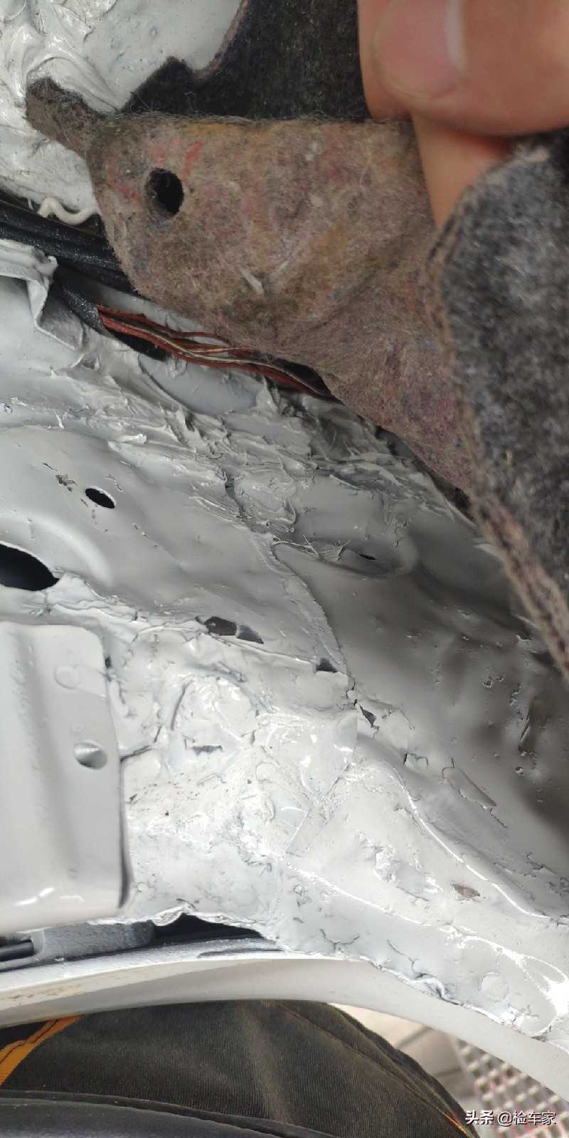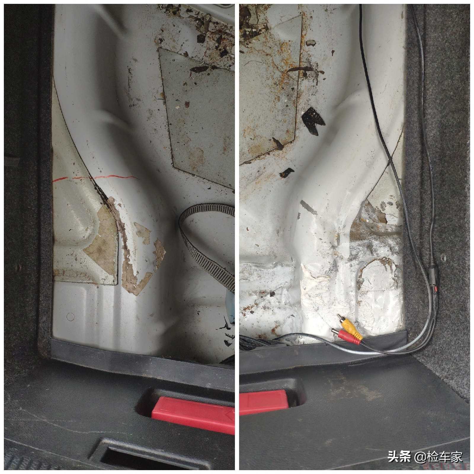 将备胎取出观察整个备胎槽左右对比,右侧有着明显的变形打胶修复,而右侧备胎槽变形,最严重的部分下方正是他的右后纵梁。目前已经得出该车辆为国家定义的事故车了。