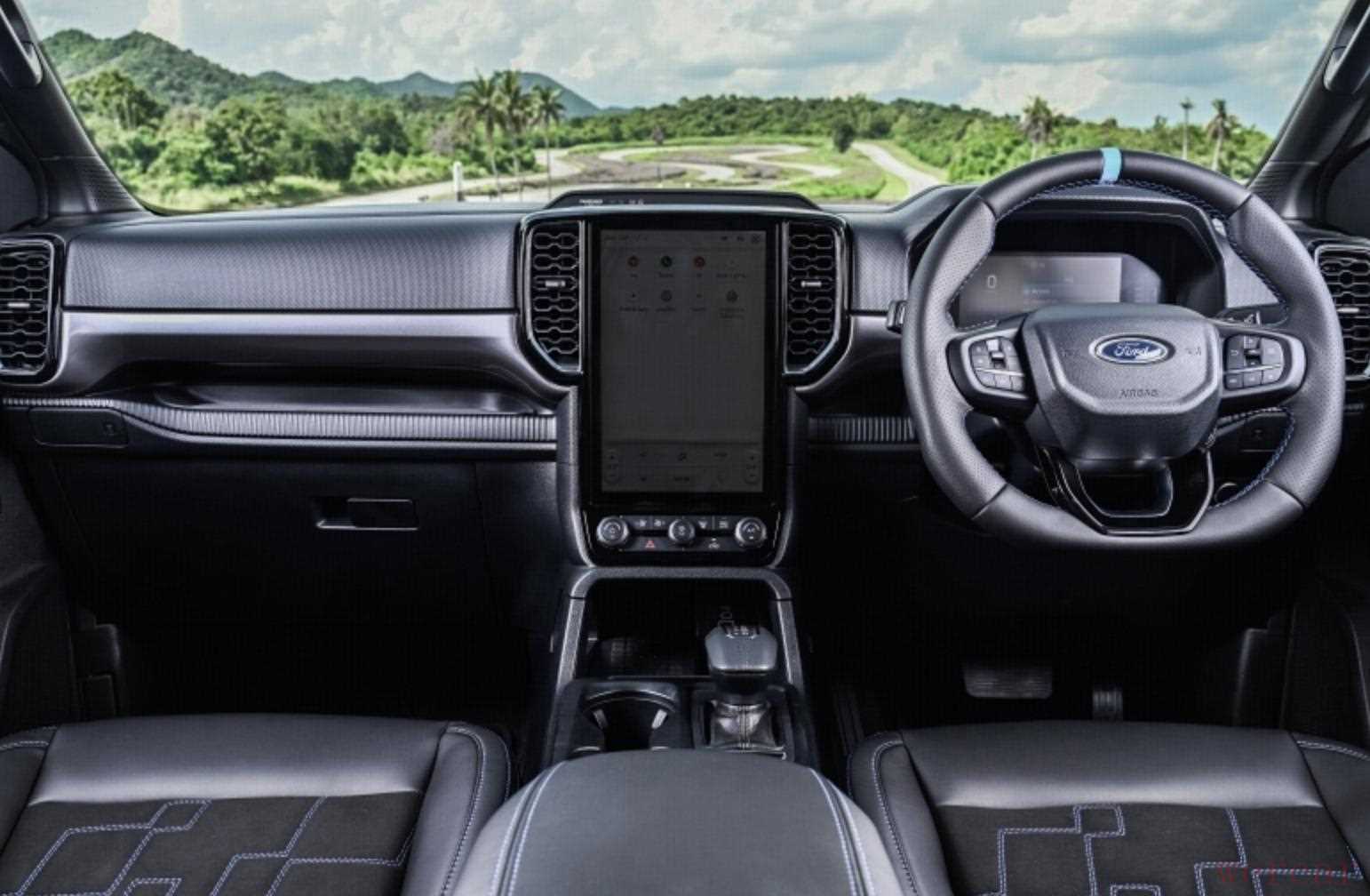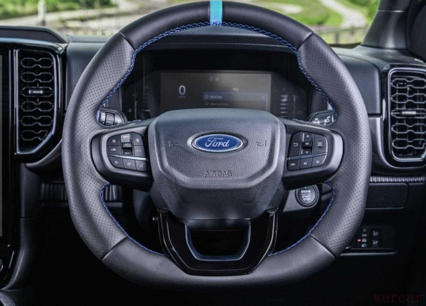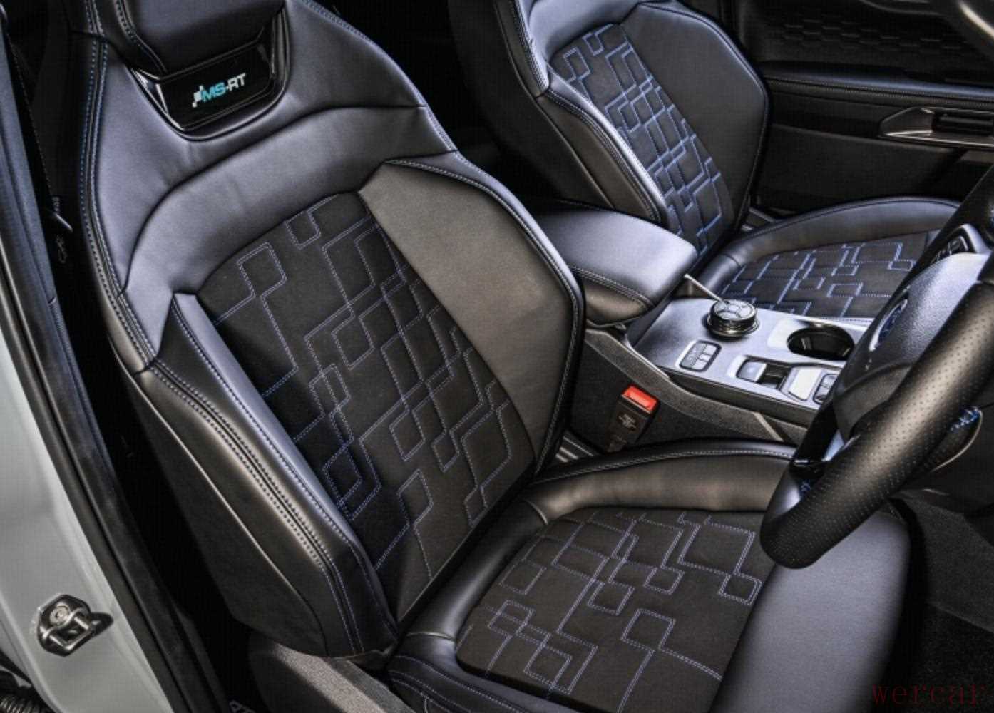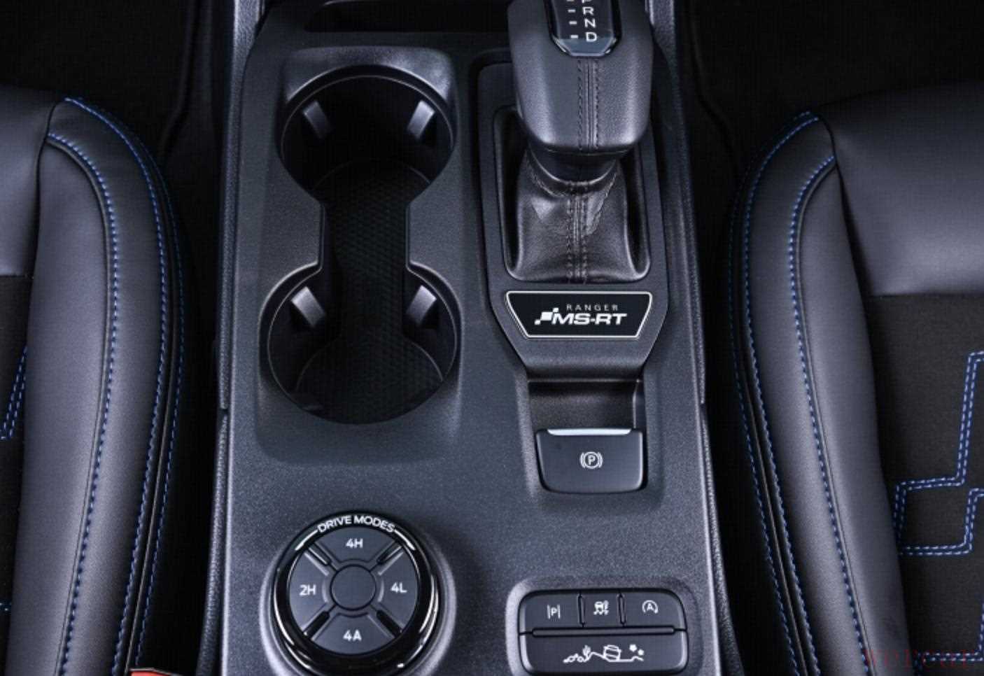 福特Ranger MS-RT内饰整体以黑色调为主,并在方向盘、中央扶手、座椅等细节使用蓝色缝线处理。同时,该车还在方向盘中间位置设计有蓝色回正标识,配备运动型座椅,细节加入MS-RT标识。值得注意的是,福特Ranger MS-RT配备有12英寸中控屏、双区空调、倒车影像、自适应巡航、手机无线充电、驾驶模式选择等配置。