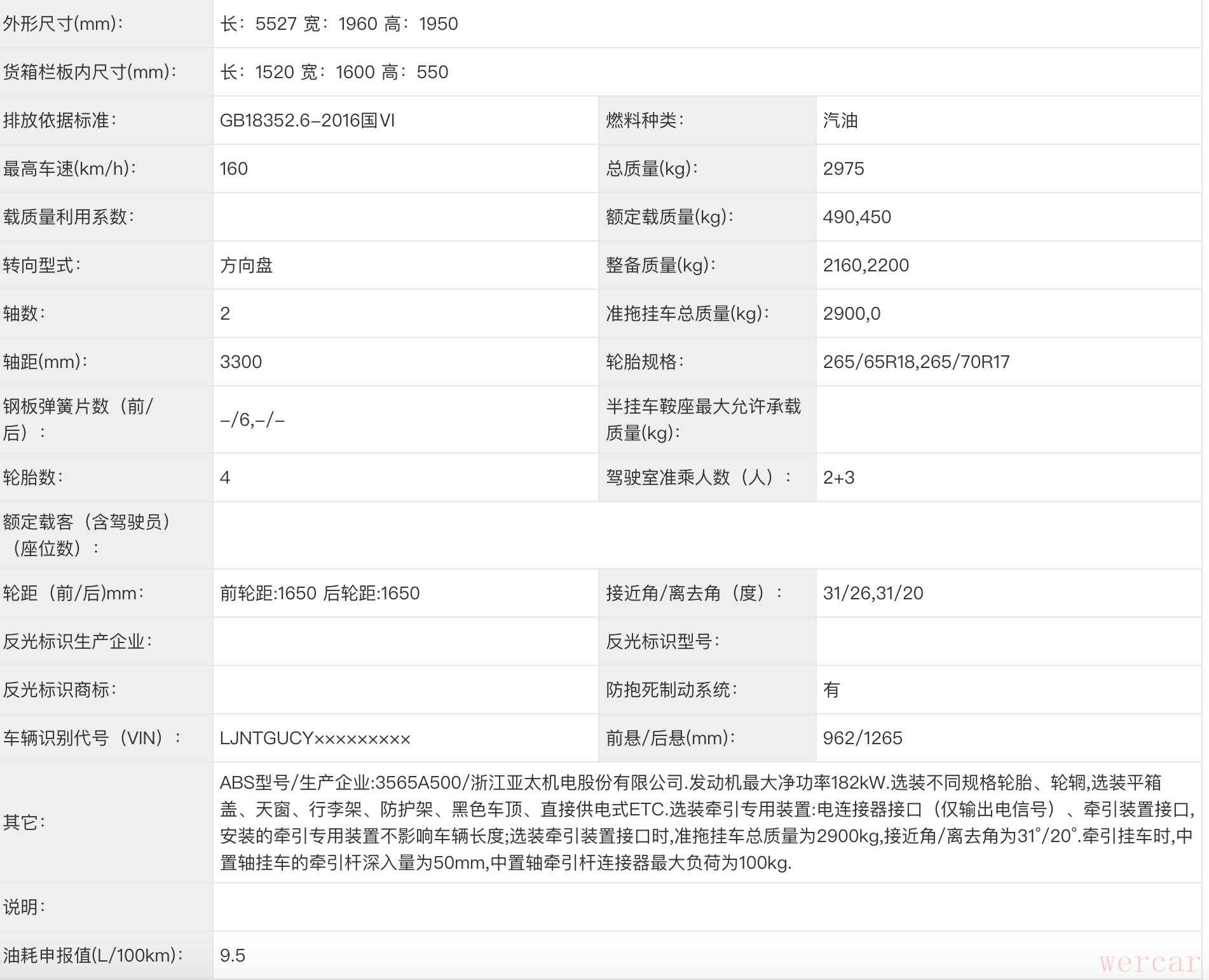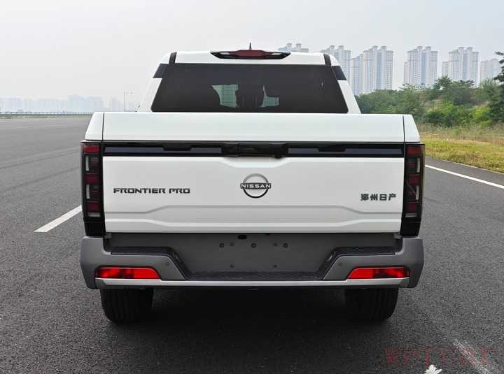 日产Frontier Pro尾部相比日产Frontier Pro PHEV取消贯穿式LED灯带和NISSAN字母标识,并调整为黑色贯穿式饰条和日产车标。目前该车仅在工信部申报有一种车身尺寸,具体长宽高分别为5527/1960/1950毫米,轴距为3300毫米,货箱栏板内长宽高分别为1520/1600/550毫米,额定载重质量在440-490公斤,部分车型具备2.9吨和3吨拖挂资质。