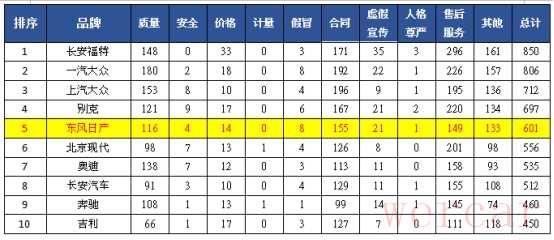 新华网北京3月13日电 3月12日上午,中国消费者协会发布2017年度全国消协组织受理汽车产品投诉情况分析。从投诉涉及的品牌来看,东风日产被投诉601次,排名第五。