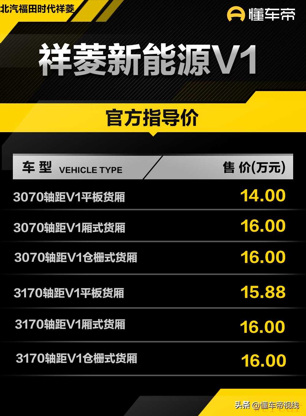 日前,我们从福田时代祥菱获悉,祥菱新能源V1正式上市。该车可选两种轴距,以及平板式货厢、仓栅式货厢和厢式货厢三种货厢结构,六个款型指导价区间为14万-16万元。