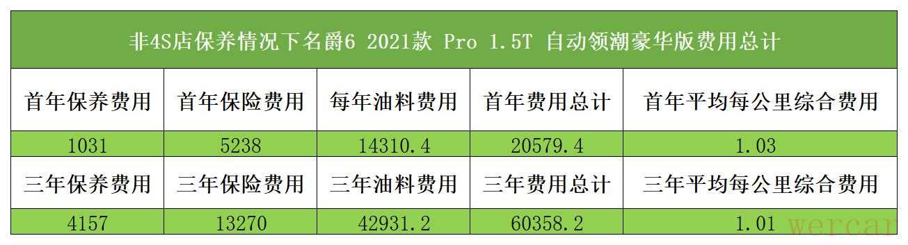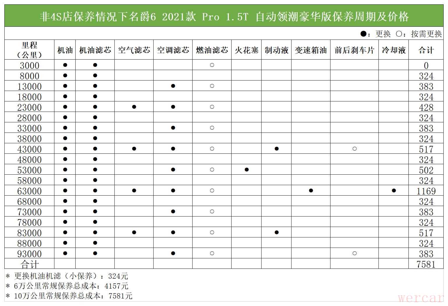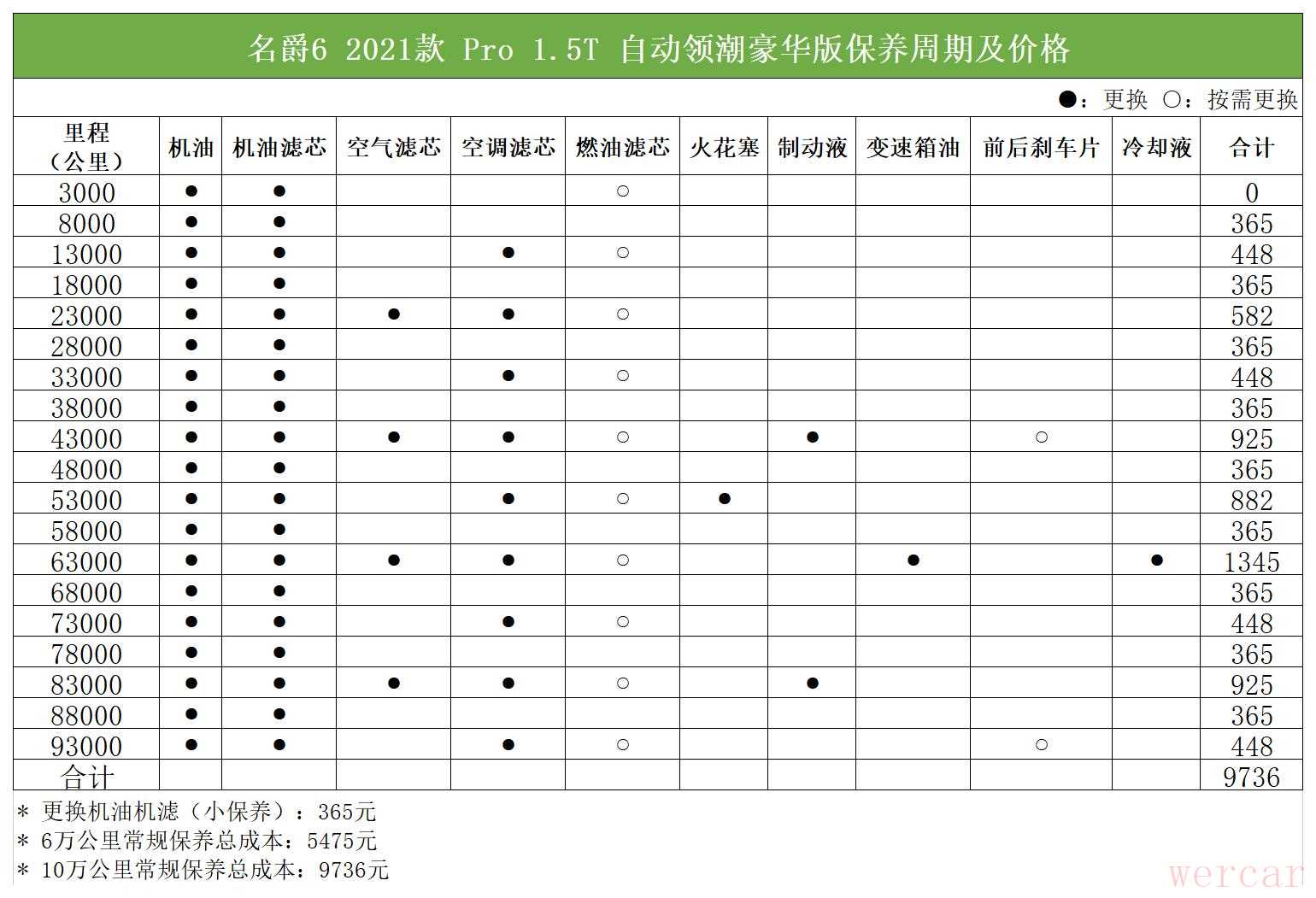 以名爵6 2021款Pro1.5T自动领潮豪华版为例,更换机油机滤(小保养)的成本约为365元,按照一年行驶两万公里计算,首年保养费用为首年保养费用为1178元,6万公里常规保养总成本为5475元,10万公里常规保养总成本约为9736元。非4S店保养价格: