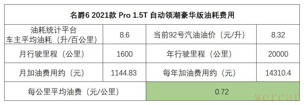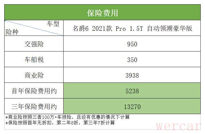 在保险、税费部分,以名爵6 2021款Pro 1.5T 自动领潮豪华版为例,首年的保险费用约为5238元(车船税+交强险+商业险),3年总费用约为13270元。需要注意,如果在首个保险周期内没有出险或违章,次年的保费还可以打折,按照商业险第二年八折,第三年7折计算。三、燃油费用