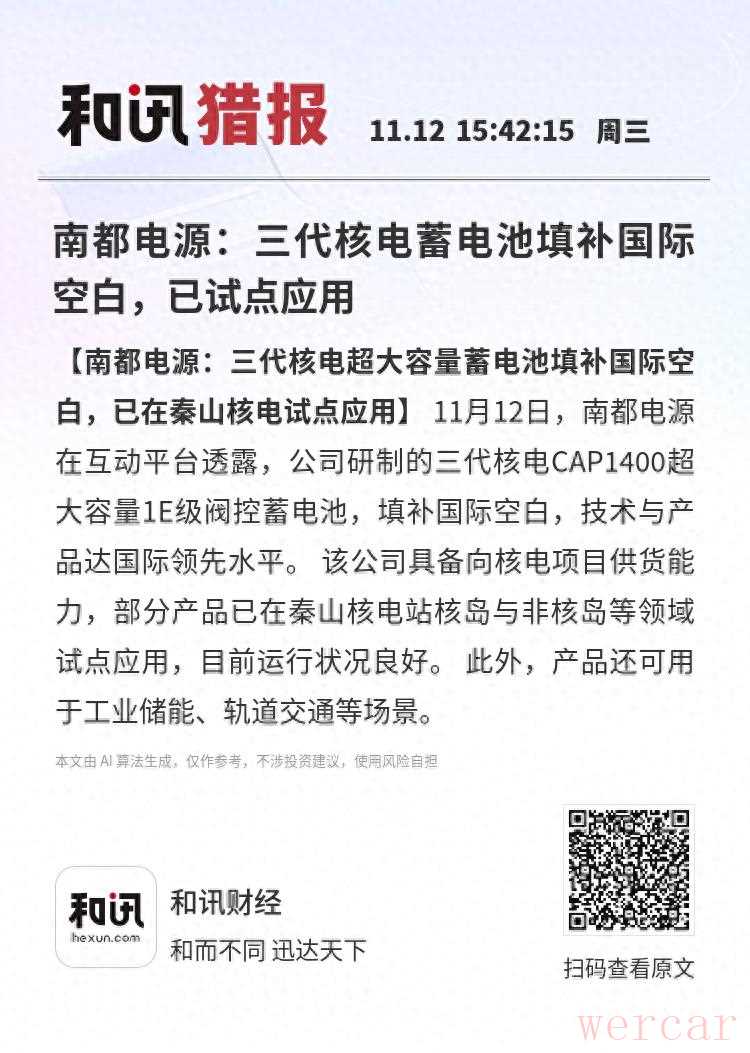 【南都电源:三代核电超大容量蓄电池填补国际空白,已在秦山核电试点应用】11月12日,南都电源在互动平台透露,公司研制的三代核电CAP1400超大容量1E级阀控蓄电池,填补国际空白,技术与产品达国际领先水平。 该公司具备向核电项目供货能力,部分产品已在秦山核电站核岛与非核岛等领域试点应用,目前运行状况良好。 此外,产品还可用于工业储能、轨道交通等场景。