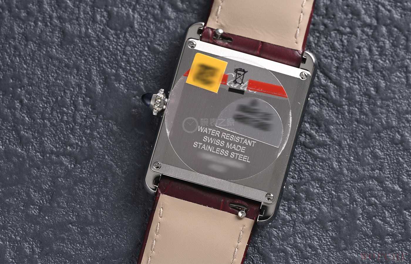 WSTA0056保持了坦克系列一贯的矩形结构,线条干净利落,边角略作圆润处理,在理性与柔和之间取得了平衡。整表尺寸为33.7 x 25.5毫米,厚度为6.6毫米,属于比较纤细的尺寸,贴合多数女性手腕的佩戴习惯。表壳采用抛光精钢打造,光泽感充足。整个外观看起来简洁、平衡,没有过多复杂的结构或者装饰,让人一眼就能识别出“坦克”的身影。