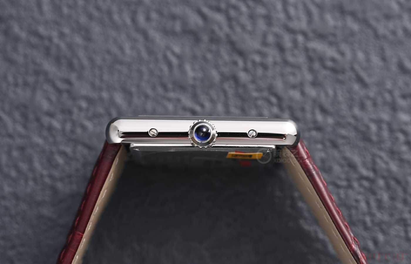 "表耳的连接:" Tank标志性的长表耳(Lugs)直接从方形表壳侧面延伸出来,并优雅地连接到表背。这种设计不仅强化了方形的结构感,也创造出一种流畅、利落的视觉效果,仿佛是肩部佩戴的装饰,极具力量和现代感