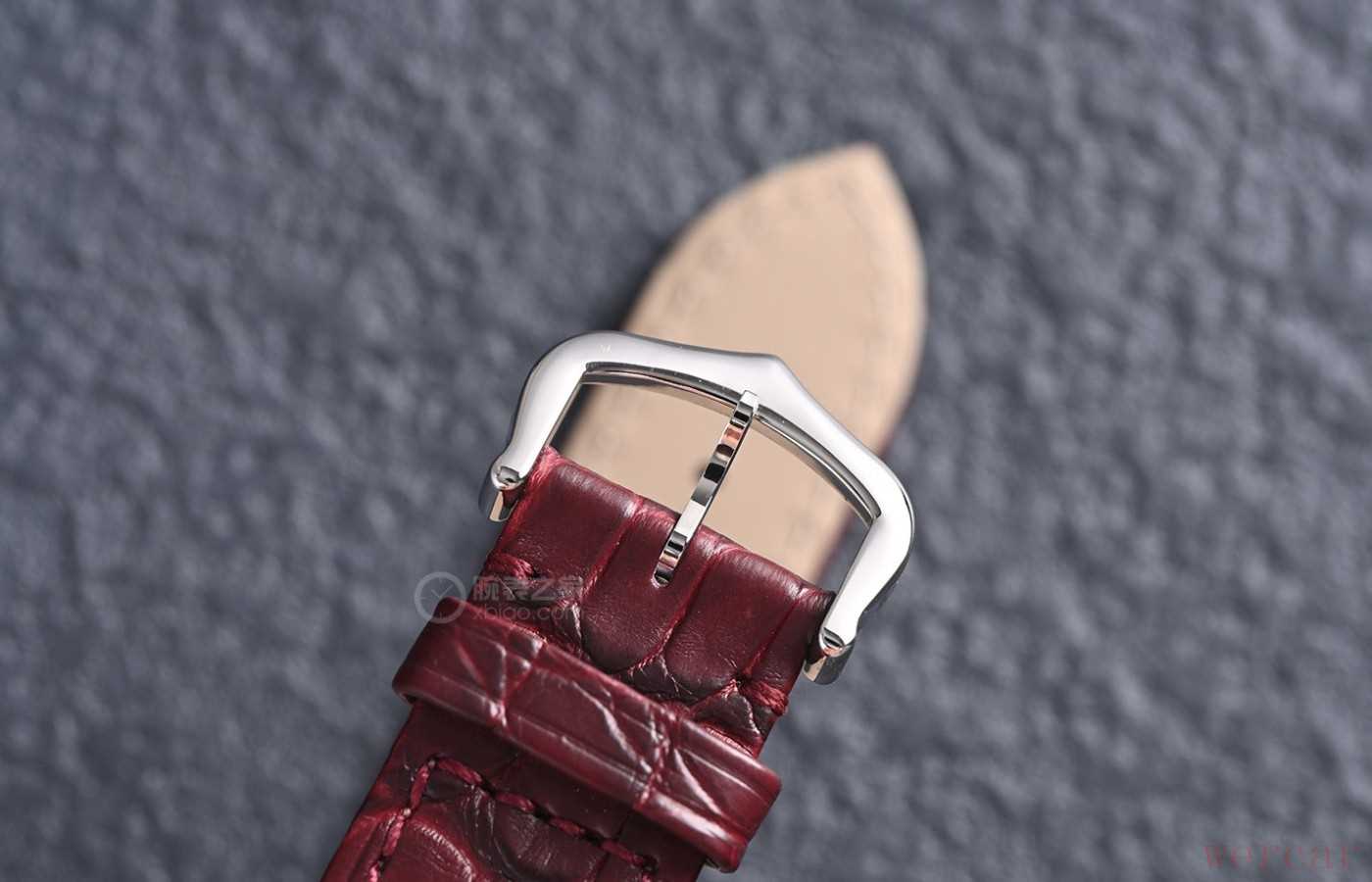 腕表搭配的是与表盘同色系的鳄鱼皮表带,表面纹理自然,色泽与表盘基本保持一致。整体给人的感觉高度统一,没有突兀感。不可更换为金属链带,但皮表带本身也更贴合Must系列的轻盈定位。表扣为针扣式,材质为精钢。这款腕表采用密底设计,表底同样为精钢材质。防水性能为30米,基本可以满足日常生活的需要。