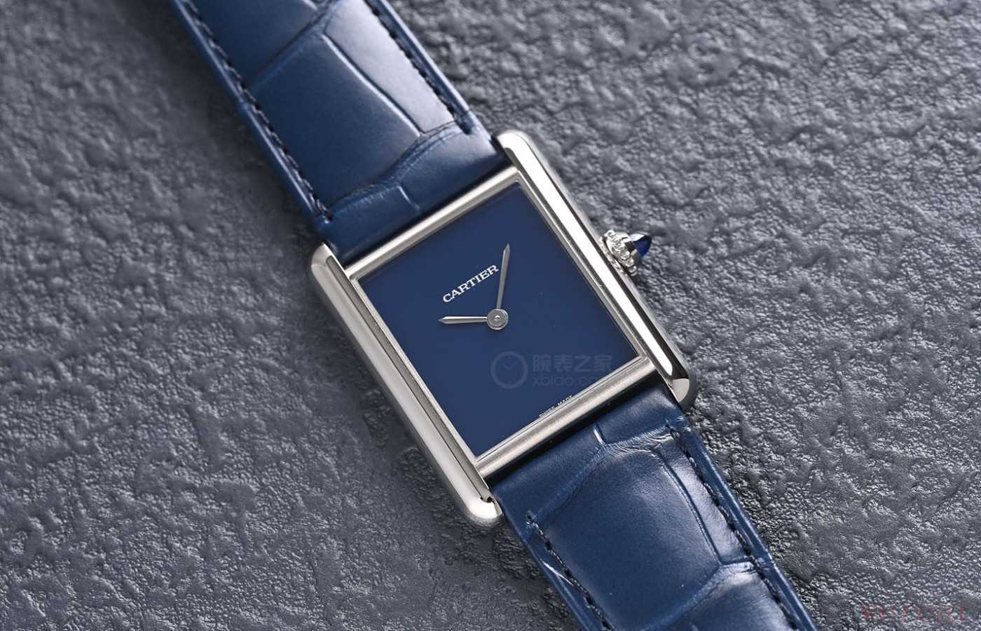 这款腕表最吸引人的地方,在于它所采用的表盘颜色。色彩饱和度非常高,表面为漆面处理,在不同光线下略带反光,不管是绿色、红色或蓝色款,都非常的亮眼。表盘设计极为简约,没有时标,也没有日期窗,只有两根剑形指针以及12点位的品牌logo。这种做法显然是为了将视线集中在表盘色彩本身上,同时强化坦克Must系列的极简风格。这种“去装饰化”的处理其实非常考验整体比例与细节打磨,卡地亚在这一点上掌握得非常得体。表镜采用蓝宝石水晶玻璃,透明度高,耐刮性能优秀,也提升了整体表面的平整度和观感质感。