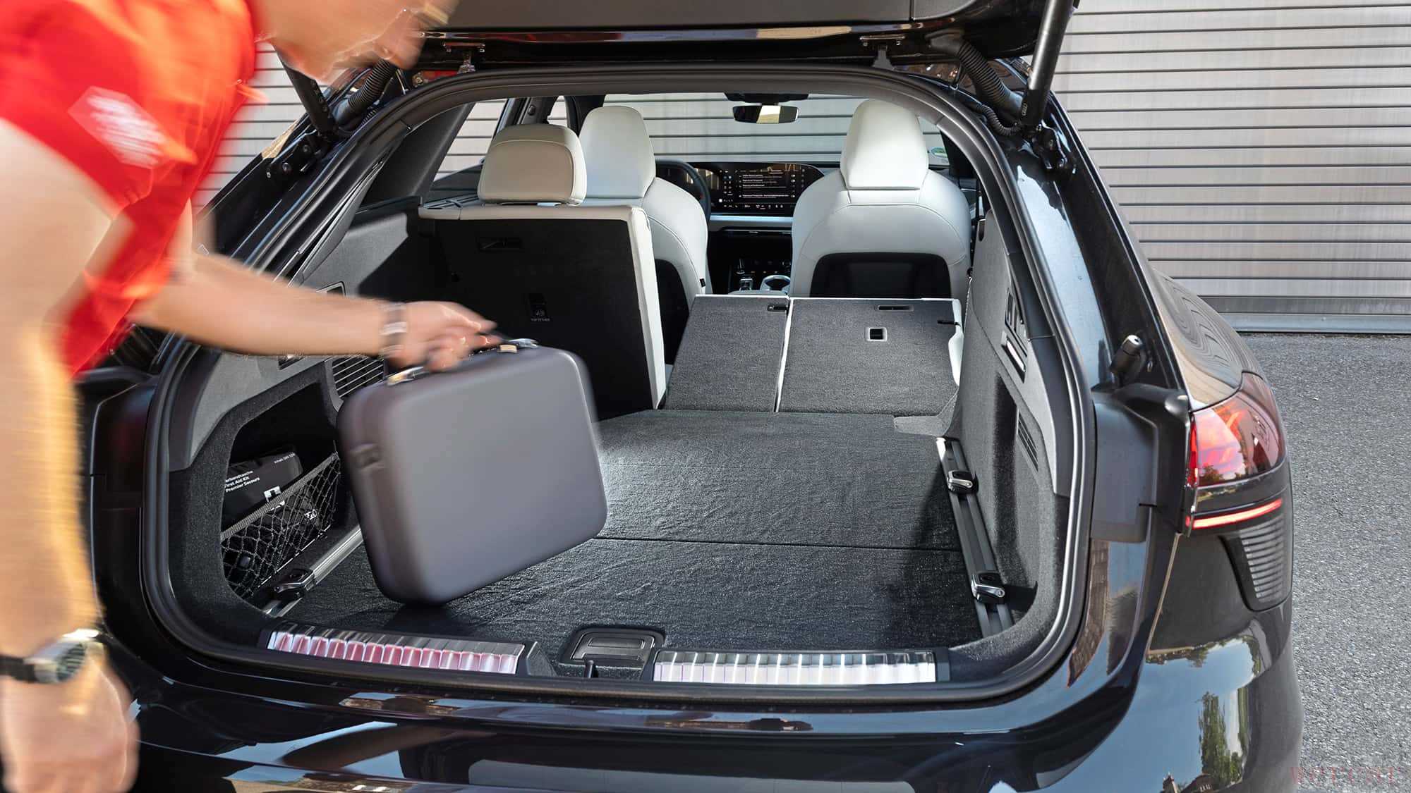 打开行李厢的方式优雅——脚踢感应或按键自动开启。但打开后令人失望:容积仅约470升,比前代少近100升。反观相同动力的S5 Avant也有450升,而竞争对手,如奔驰E级旅行车更为宽敞。电池冷却系统与逆变器占据了不少空间。座椅靠背也无法调节倾角,灵活性欠缺。