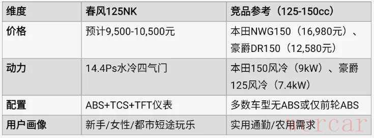 合理预期:125NK若定价9,500-10,500元(ABS+TCS版),将形成对本田190系列(16,180元起)和豪爵DR150(12,580元)的降维打击。