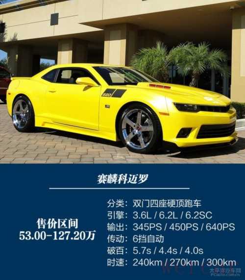 赛麟科迈罗(Saleen Camaro)是赛麟追热点(变形金刚)弄出来的一台改装车,而赛麟其实是御改福特的主儿。考虑到3.6L V6的雪佛兰原版科迈罗也要去到49.98万起售,加3万多17PS动力和赛麟品牌的高逼格绝对超值。至于127.20万的6.2SC V8车型,那是绝对的牛逼,绝对的没必要买……