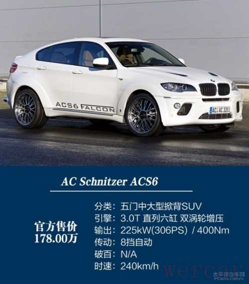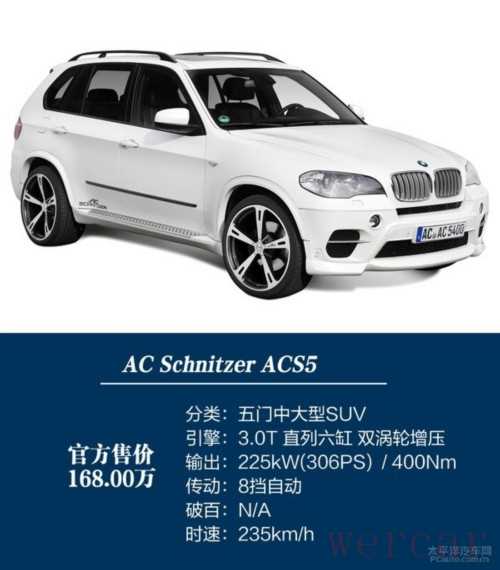如何看出AC Schnitzer是一家小厂?它家的ACS5车系分别来自两个毫不相干的宝马车系——宝马5系、宝马X5……好了回到正题,今天我们要聊的国内在售ACS5来自于上一代宝马X5(暂且命名为ACS X5吧反正大家都这样认的),而其实他们已经研发了新一代X5为基础的新一代ACS5车系(没入华而已)。国内在售的ACS5,性能极其惨淡,306PS输出喂猫都不够吃。