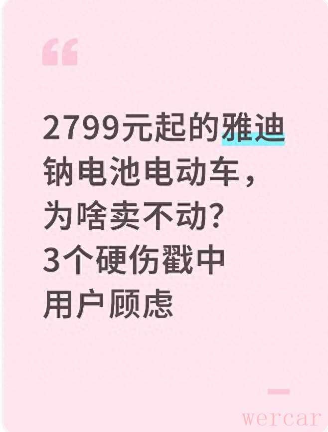 雅迪钠电池电动车2799元起的定价确实非常有吸引力,主打的是高性价比和应对城市通勤。然而,尽管价格诱人,市场上似乎并未出现预期的火爆销售,甚至有说法称其“没人买”。这种情况的出现,往往不是单一因素造成的,而是多个问题叠加的结果。结合您提到的“3个硬伤”,我们可以分析以下几个可能的原因: