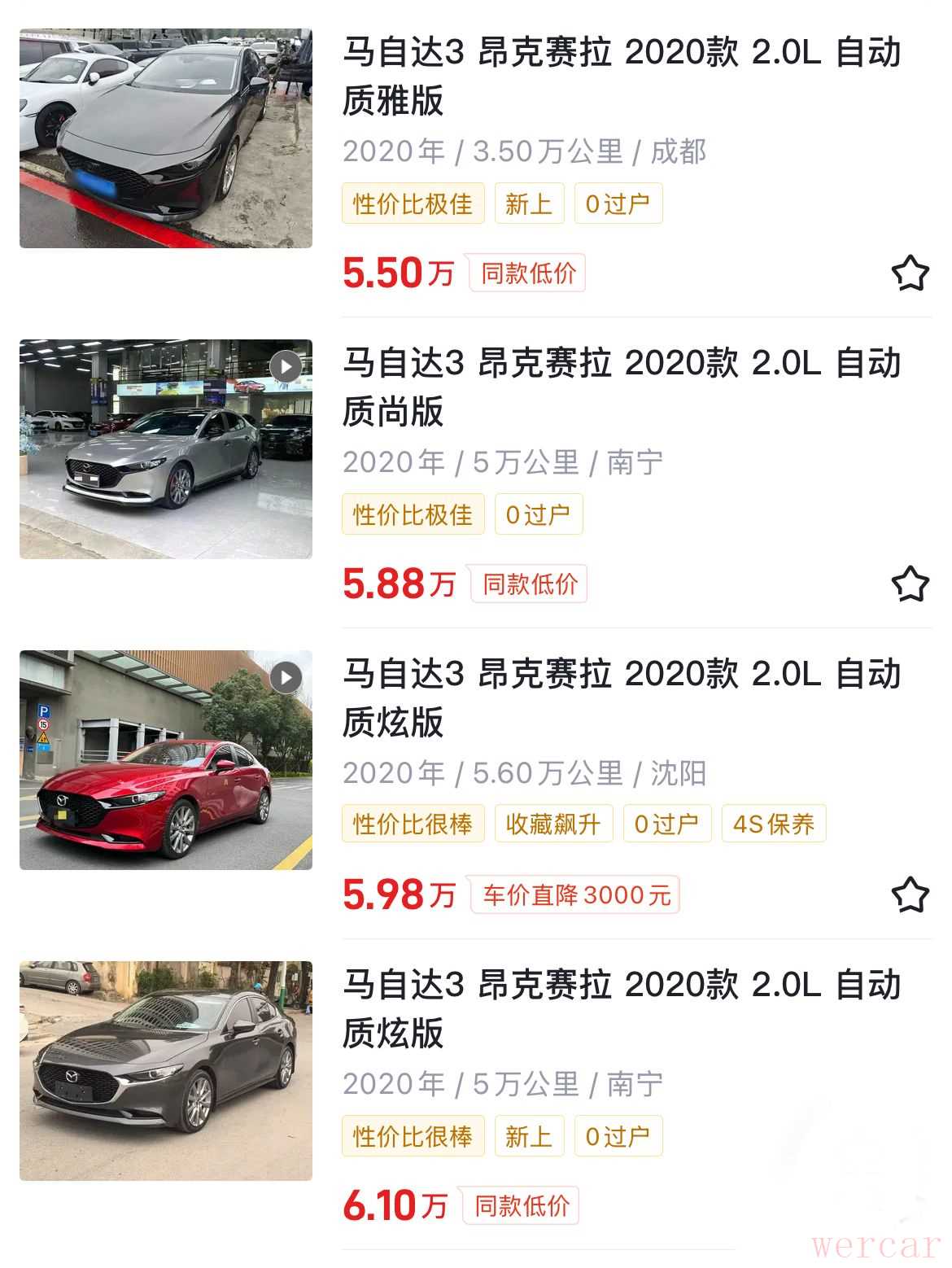 目前2020款1.5L排量的昂克赛拉,公里数5万以内的,标价也就5万多,实际成交价5万左右。但是预算能加一点,还是更推荐你买2.0L排量的,同样是公里数较小的,车商报价6万左右,实际5万大几就能成交。