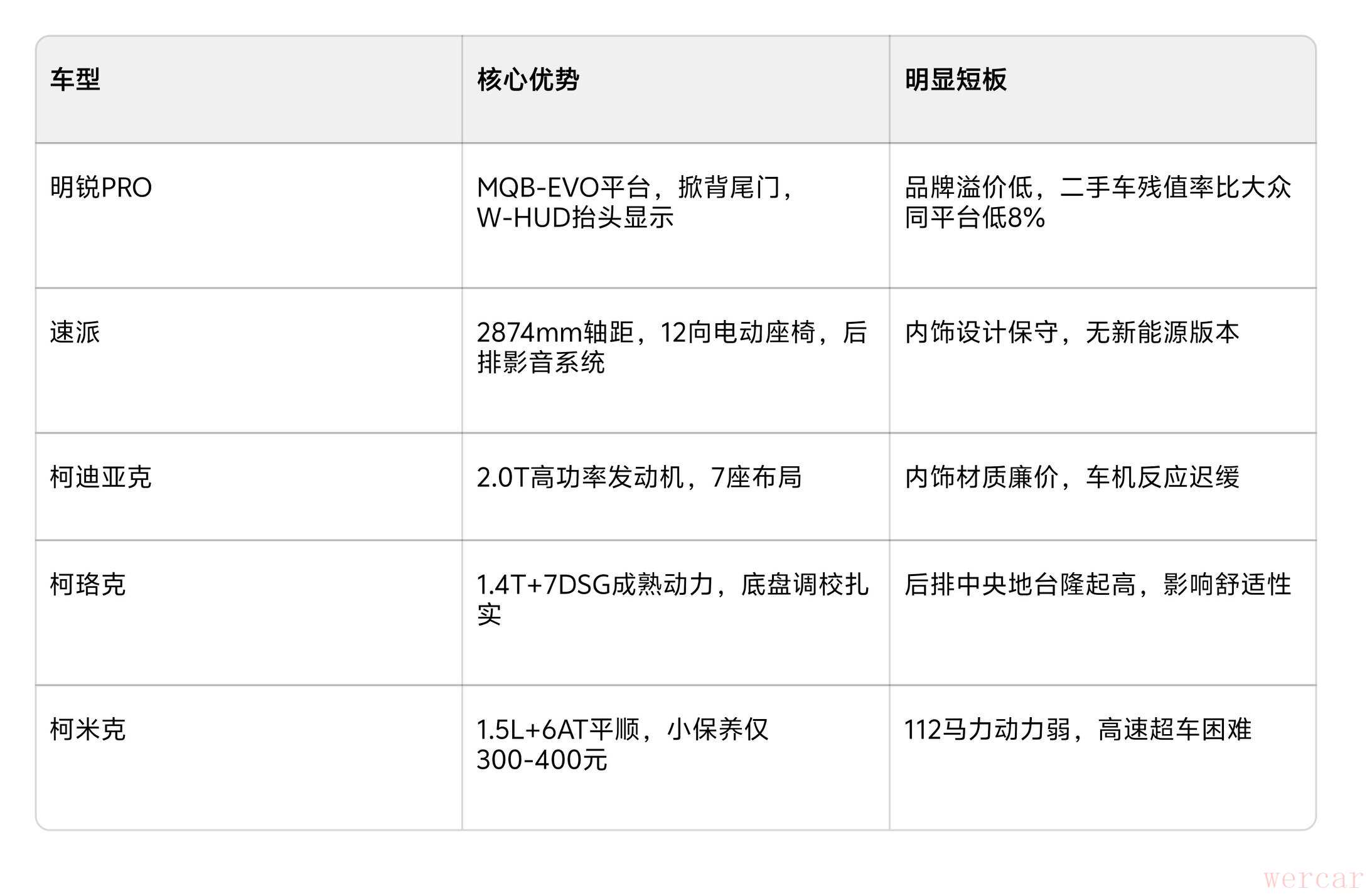 - 当下困境:新能源转型滞后成致命伤,2024年在华销量仅1.75万辆(同比下滑23%),核心车型柯米克月销不足500辆;目前仅保留明锐PRO、速派、柯迪亚克等燃油车型,电动化布局未实质推进。