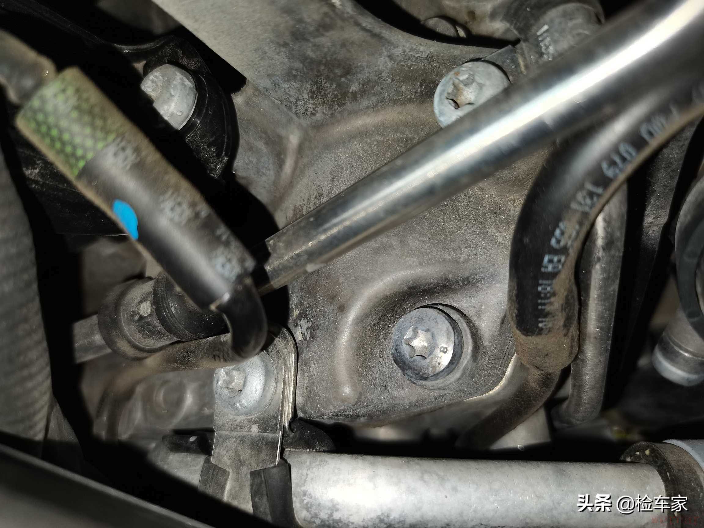 前部水箱框架和左右叶子板支架的固定螺丝也都是原厂状态,前防撞梁无损伤更换,可以排除车头前部的事故嫌疑。
