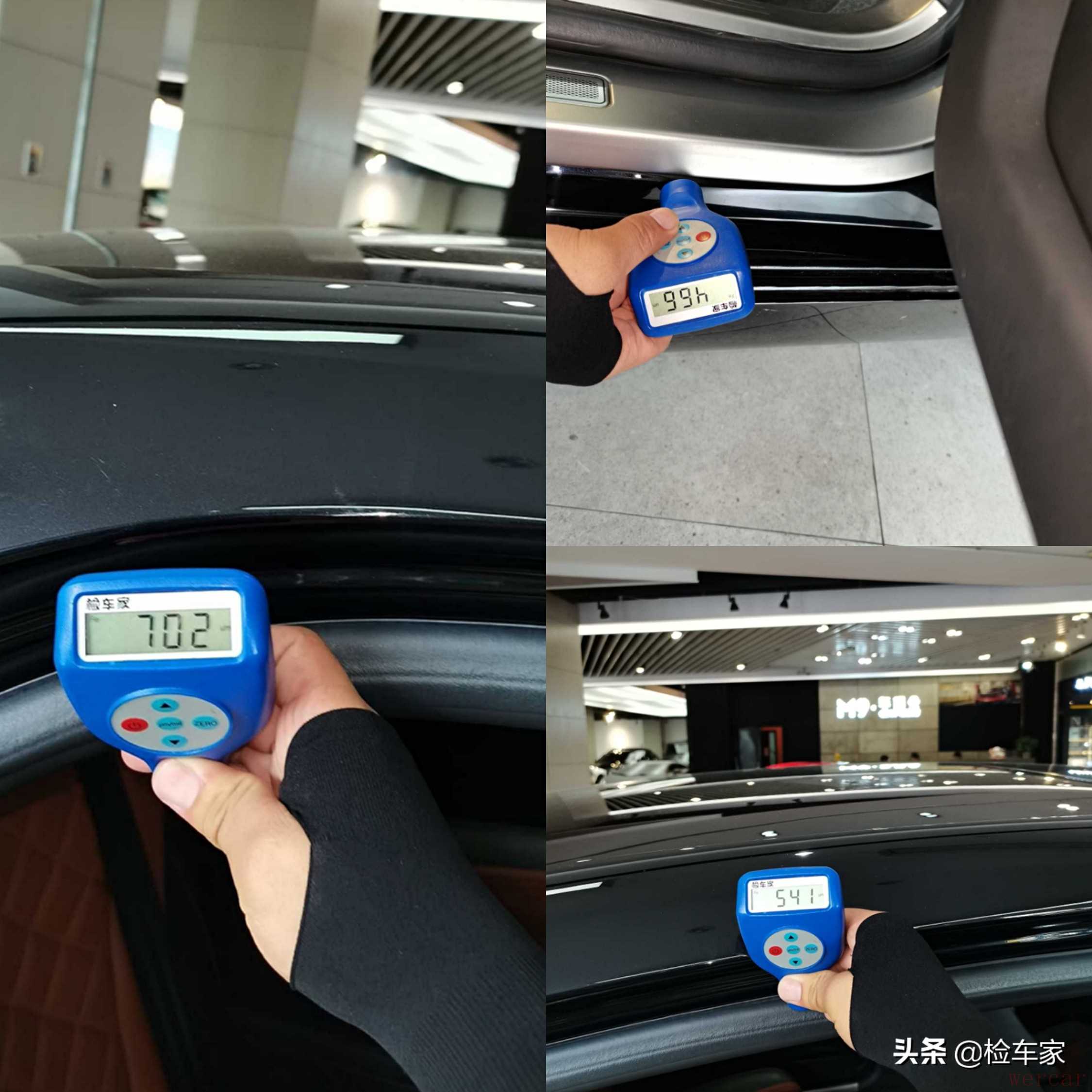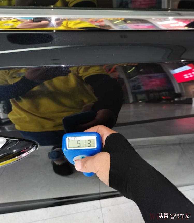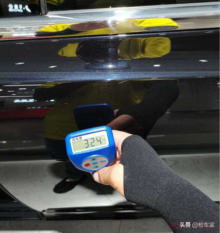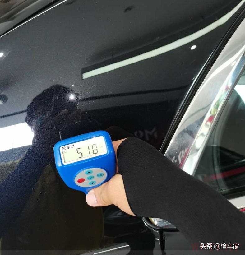 拿出仪器测一下漆面的情况。从车头开始,机盖、左前叶子板、左前门都还好,左后门漆面厚度300多um,喷漆了。