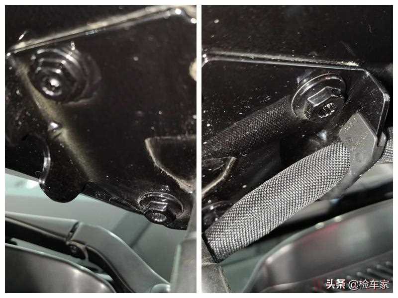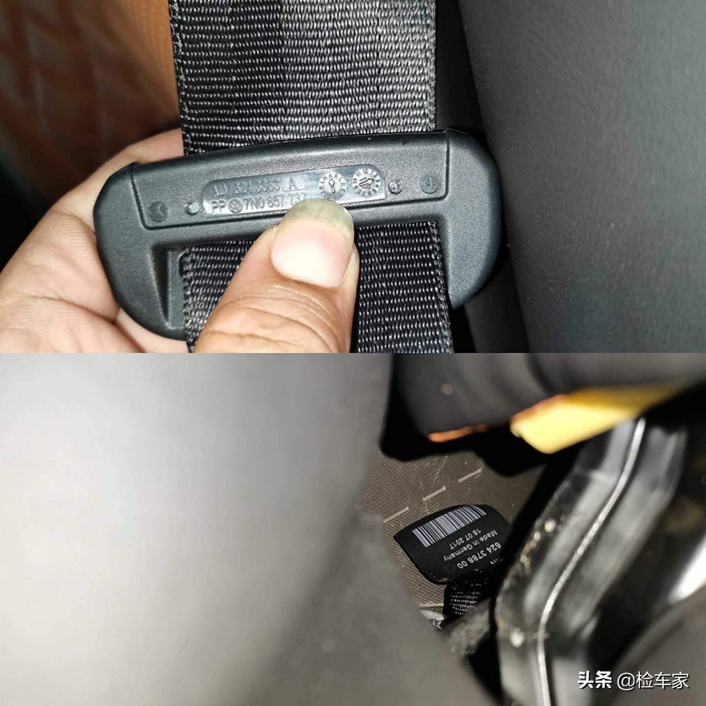 右B柱钣金喷漆,并且右B柱内饰板未安装到位,观察内饰板的生产日期为2018年4月25号,而车辆出厂时间为2017年2月,所以,内饰板是后更换的。为什么要重点说内饰板呢?因为内饰板里面是安全带和侧气囊。里面的安全配件动没动暂时不知晓,一会儿检查内饰的时候看车行让不让把内饰板拆下来检查。