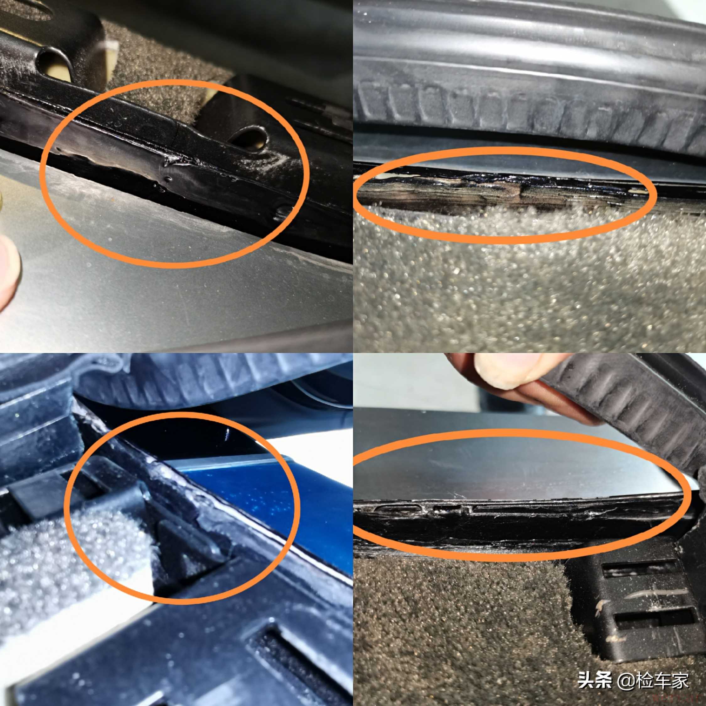 扒开门框胶条,发现门槛梁和底边梁位置的封边处有焊接打胶痕迹,看来右侧的事故撞击力度不小啊!门槛位置受撞击变形严重,不好修复,原车主又不愿意切割更换,钣金工只能把焊点打开,通过内部的敲击把变形还原以后再进行焊接打胶处理。
