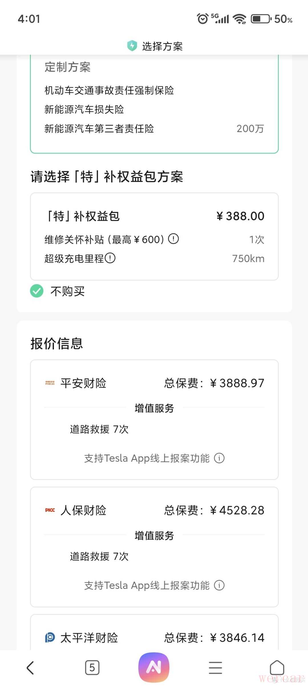 按照这个方式,我又让平安和太平洋的电话销售分别进行了报价,相比较来说的话,太平洋的就比较执着,他一定会让我去上这个尊享的附加险,这样价格还是4000多,但是平安的话他就不强制你了,如果你只想上基本险种,他也可以就是必须是车主去付费就可以了。最终平安给的报价是3800多,将近3900,然后可以返50的红包,还可以送一些东西。相比其他电销是最便宜的,再比较特斯拉的APP上的话,也便宜了将近100块钱。