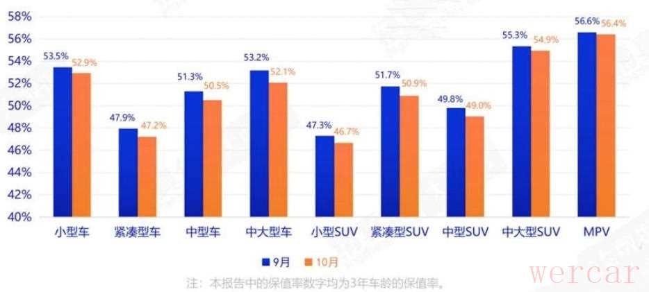 10月,小型车的保值率较高,以52.9%的保值率成绩位居各级别保值率榜单第三位,仅次于MPV和中大型SUV车型。但目前二手车市场中,小型车和紧凑型车保值率仍较低,分别为46.7%和47.2%。从10月数据看,保值率最高车型与最低车型的差值进一步收窄至10%以内,凸显市场整体疲软。