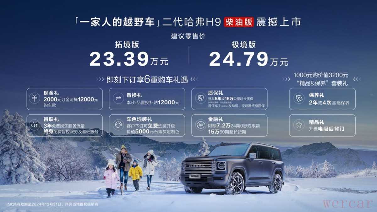 12月5日,二代哈弗H9柴油版正式上市,两款车型的售价分别为23.39万元和24.79万元,在配置相同情况下,价格比汽油版车型贵1.8万元,这一定价与国际市场定价惯例基本符合。