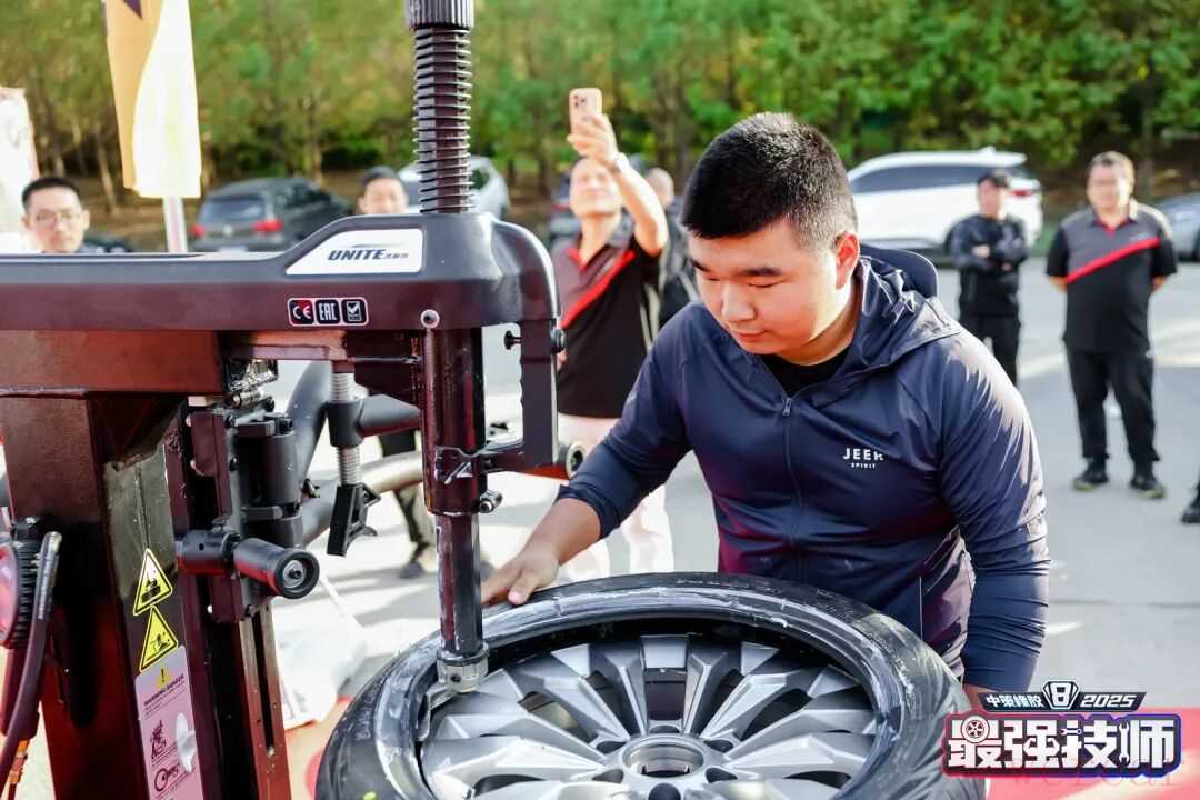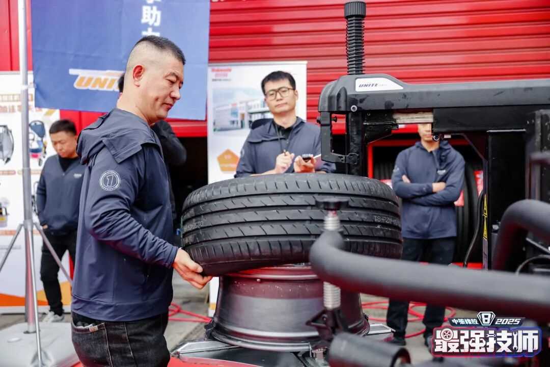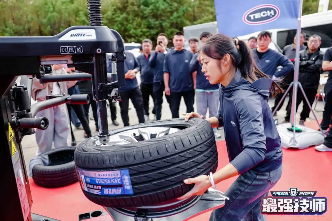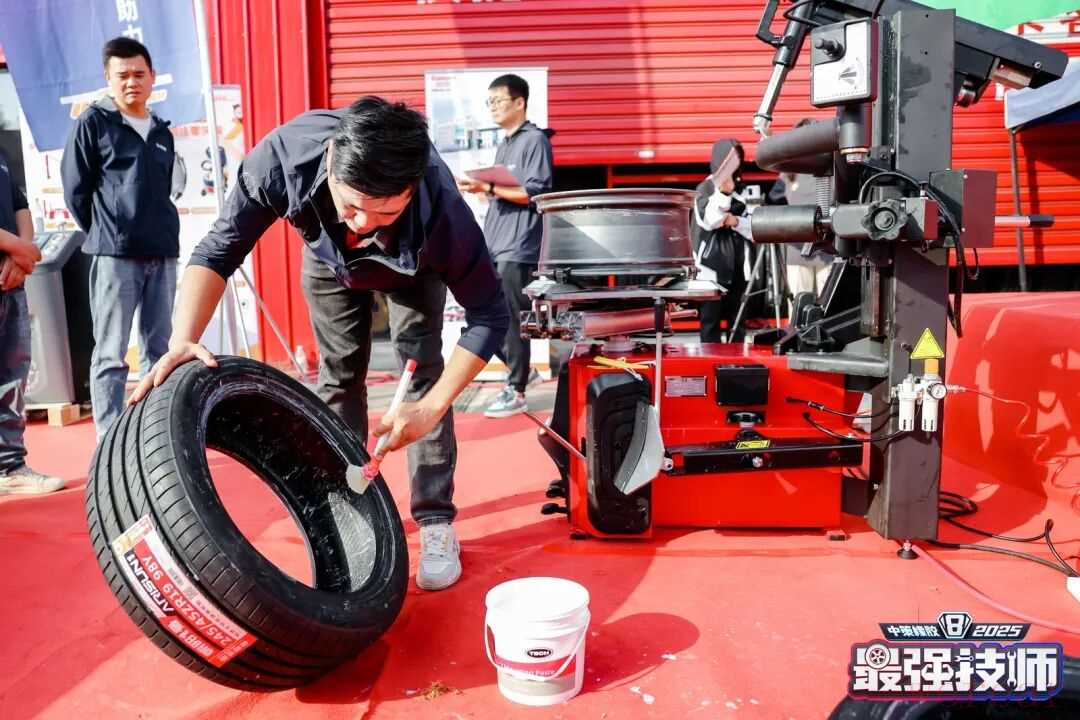 比赛中,技师们全神贯注,手法娴熟,拆胎机流畅运转,轮胎安装一气呵成,展现了行业顶尖水准。