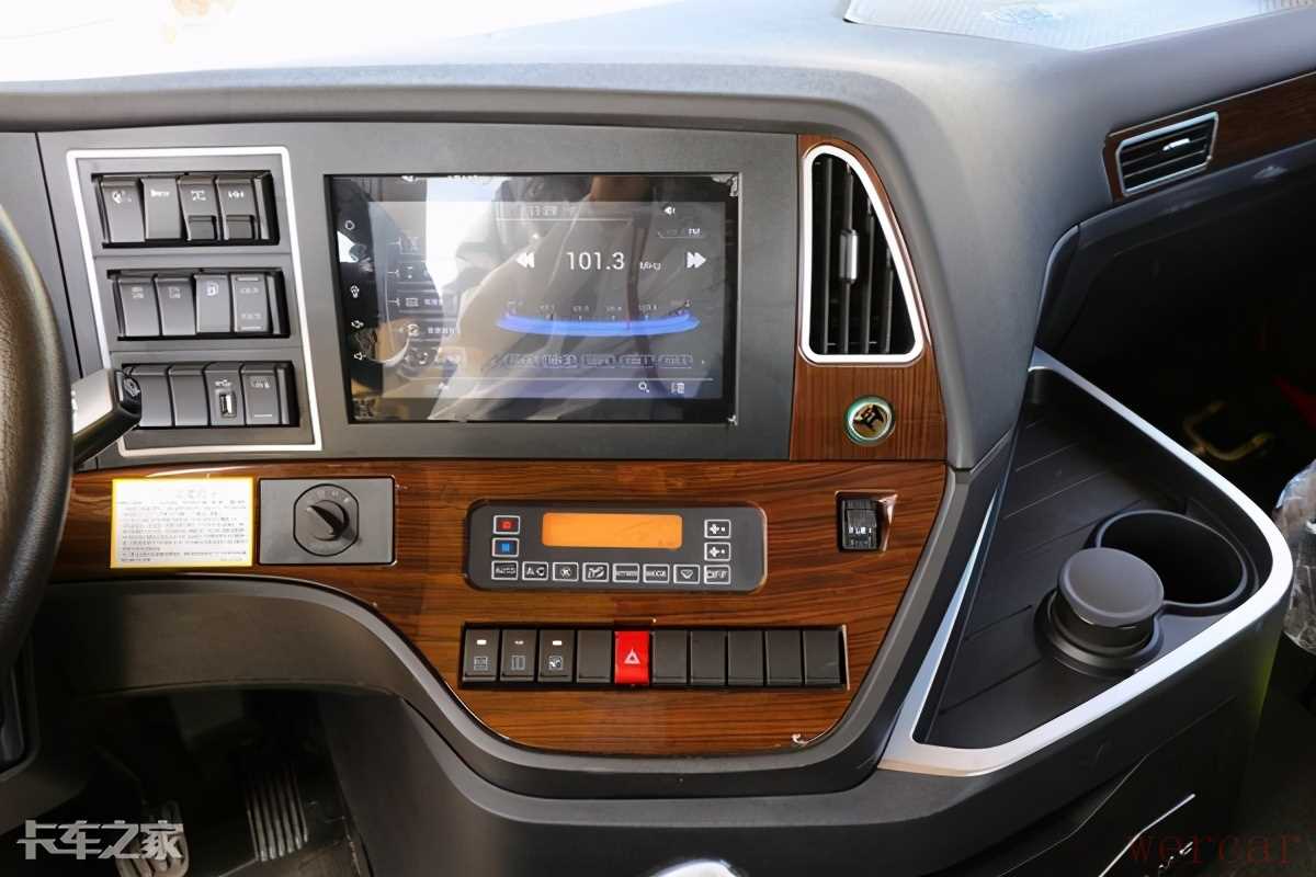 中控区域左侧布置有驾驶室翻转、轴间差速锁、轮间差速锁、ABS、后视镜电加热、节油开关等按键和USB接口,右侧布置有10寸车载大屏和自动空调等。中控台整体采用类似原木的装饰点缀,看起来比较精致。