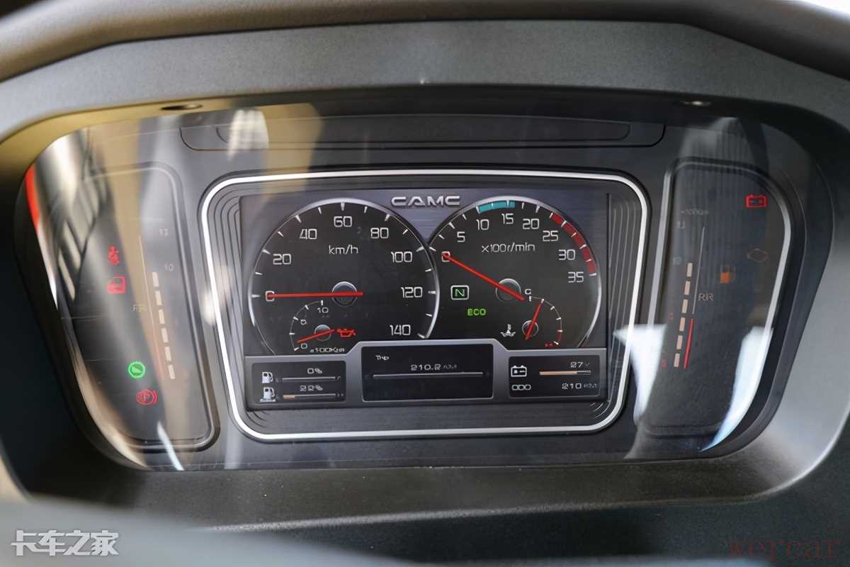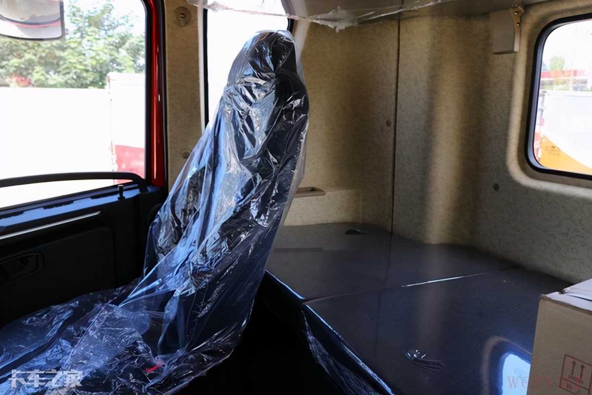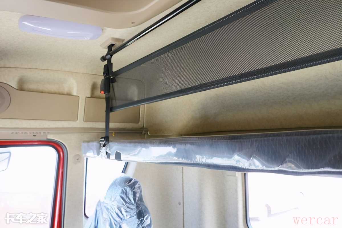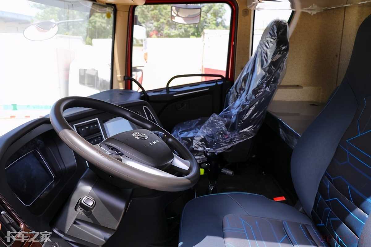 轻量化设计方面,这款车发动机大量采用新型材料,变速箱、轮毂、储气筒、油箱均采用铝合金材料,中后桥同样追求轻量化设计,最终整车自重来到8.805吨,在同级别重卡产品中表现尚可。高顶双卧低地板 配置定位高端