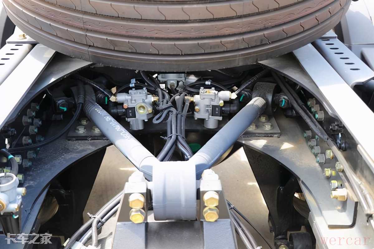 车桥方面,整车匹配7T的前桥和免维护的汉马中后桥HL460,后桥速比为4.1。整车采用自主研发的汉马动力链,维护保养成本会更低,同时也特别耐用。