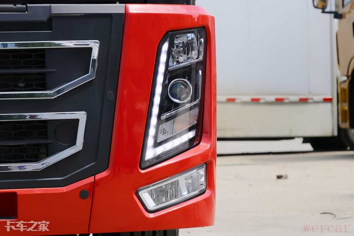 驾驶室顶部标配导流罩,能在车辆高速行驶时大幅降低风阻,提高燃油经济性。两侧的气喇叭声音响亮,传播距离远,能起到很好的警示效果。两边的示廓灯能在夜晚行车时保障安全。黑色遮阳罩可大大减轻阳光直射对驾驶员视线的影响。