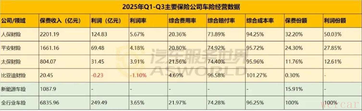 你可能想不到,张老板的吐槽背后,是车险行业的“冰火两重天”。今年前三季度,车险保费超6800亿,同比涨了4.4%,赚了249亿——比去年一整年还多。但这钱,几乎全进了人保、平安、太保三家口袋:他们保费占了68%,利润却拿走90%。剩下65家公司里,26家在亏钱,连比亚迪车险都栽了。