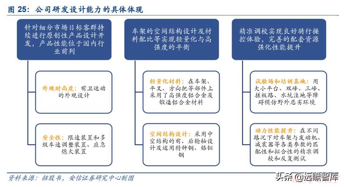 公司从车体外观设计、车架主体的结构设计、高效传动系统设计、整车性能的精准调校等多方面攻坚克难,通过经验积累及反复试验掌握各系列车型摩托车的关键性能参数,掌握各类钢铝型材及配比、空间结构设计等对产品性能的影响,达到轻量化与高强度、安全可靠的结合,使得公司的研发设计能力在非道路越野车行业处于优势地位,公司产品较市场同类产品具有更佳的使用体验。