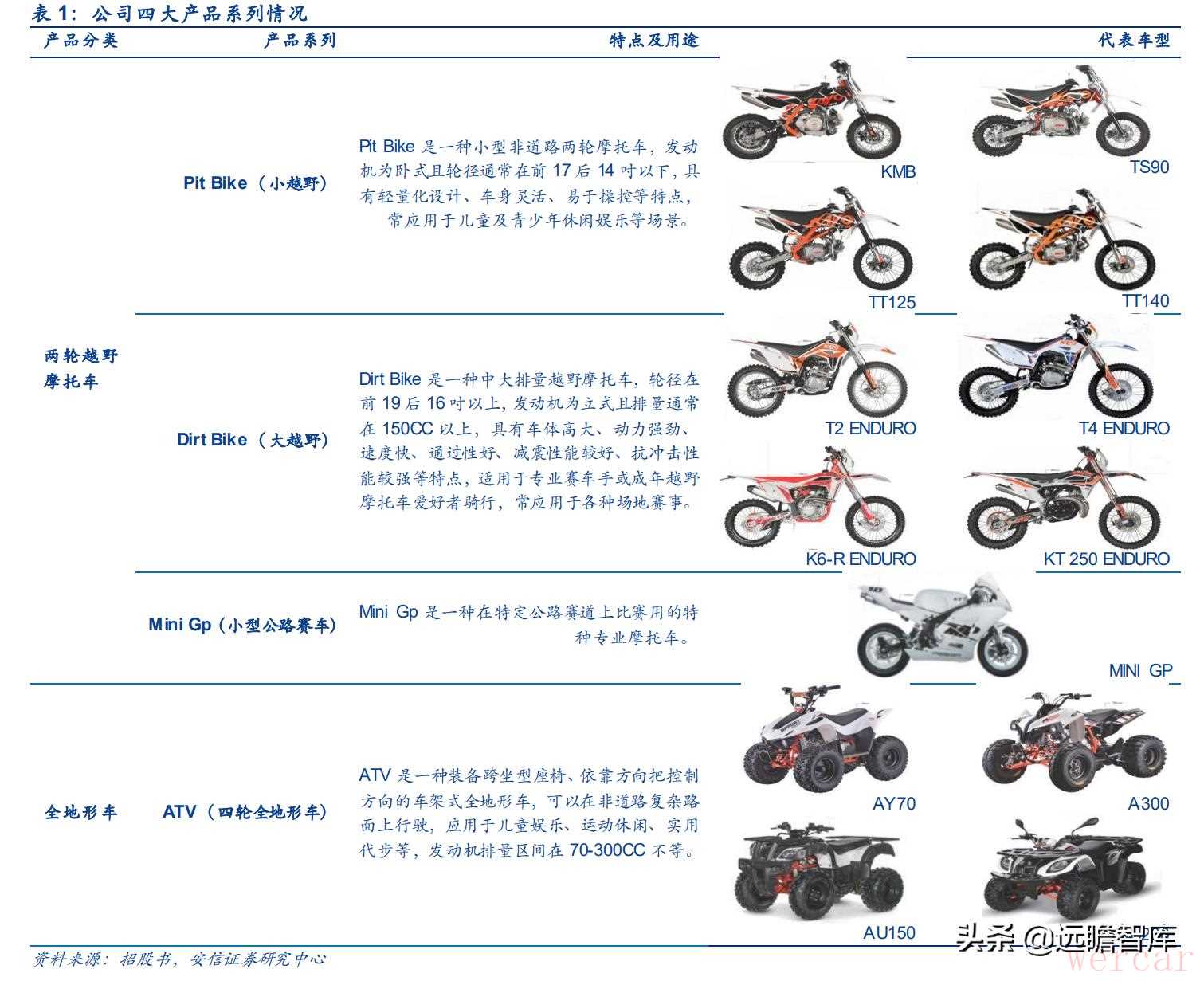 2014年开始,公司筹划并实现全地形车的开发和量产,目前公司已形成Pit Bike(小越野)、Dirt Bike(大越野)、Mini Gp (小型公路赛车)、ATV(四轮全地形车)四大产品系列,形成了较为丰富的产品体系。