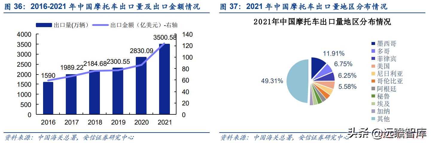 随着行业成熟度不断提升,我国摩托车出口量及出口金额不断增加。据中国海关总署数据,2021年我国摩托车出口量为3500.58 万辆,同比增长23.7%;出口金额为123.22亿美元,同比增长 43.3%。