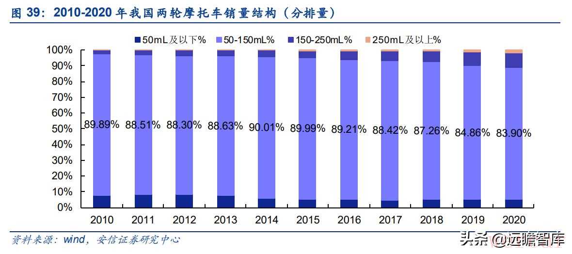 从排量结构上看,我国两轮摩托车主要以 50-250ml 为主流排量段,合计占比达 90%以上。