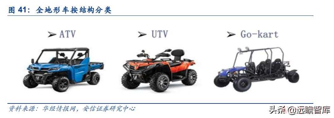 全地形车作为非公路户外休闲车辆,可以分为车把转向的 ATV 和方向盘转向的 UTV,其可以应对多种复杂环境,集实用、运动、娱乐于一身,在美国、澳大利亚等国的市场较为流行。