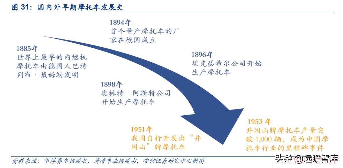 从全球摩托车的发展史来看,1885 年世界上最早的内燃机摩托车由德国人巴特列布〃戴姆 勒发明,1894 年首个量产摩托车的厂家在德国成立,“摩托”这个名词被第一次定义使用;1896 年,埃克瑟希尔公司开始生产摩托车;1898 年奥林特-阿斯特公司开始生产摩托车。