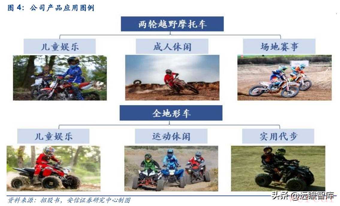公司产品主要以 50-300CC 排量为主,其中两轮越野摩托车主要应用于儿童娱乐、成人休闲 和场地赛事等,全地形车除了儿童和青少年休闲娱乐使用以外,还兼具实用代步功能,例如 用于自家庭院、旅游景区、山路林地等代步场景及农场运载货物等使用场景,用途广泛。