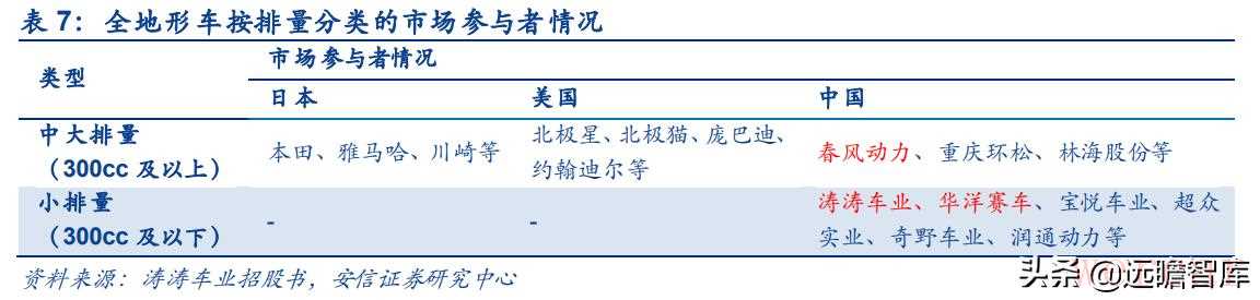 业务对比而言,北极星专攻全地形车业务,具有剃刀系列、游侠系列、运动家系列、儿童车 系列、雪地摩托系列此 5 大产品系列;涛涛车业产品业务涵盖 50cc~300cc 排量段的全地形 车、50cc~250cc 排量段的摩托车以及电动车;春风动力业务包括 400cc 至 800cc 排量段的 四轮全地形车和 125cc-500cc 及以上的摩托车;华洋赛车拥有 50-300CC 排量段的全地形车 和越野摩托车共 4 大产品体系。