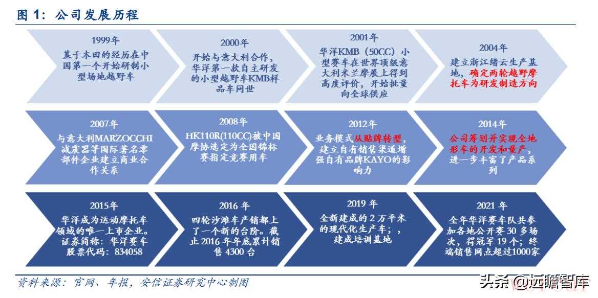 华洋团队始建于1999年,自成立以来,公司一直从事非道路越野车的自主研发、生产和销 售,设立之初,公司产品类型以两轮越野摩托车为主,且主要以贴牌生产为主,2012年开 始逐步转型自有品牌模式,丰富销售网络并增强品牌影响力。