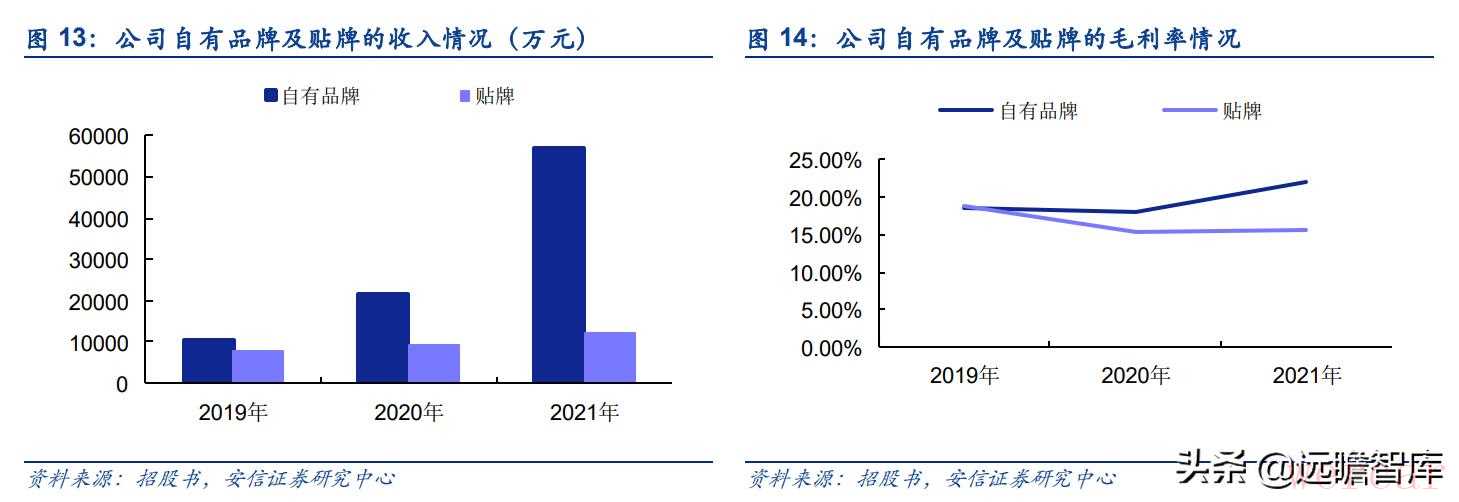 此外,2019年后,自有品牌的毛利率与贴牌逐渐拉开差距,2021年自有品牌毛利率达22.07%,高于贴牌的15.65%,产品附加值更高。