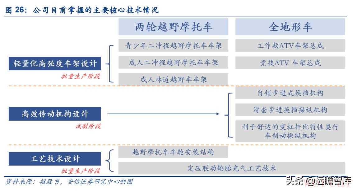 通过自主研发与创新,公司在车架主体的轻量化高强度设计、高效传动系统设计、工艺技术设计等方面已掌握了多项核心技术,主要应用于两轮越野摩托车和全地形车相关产品及生产工艺中。