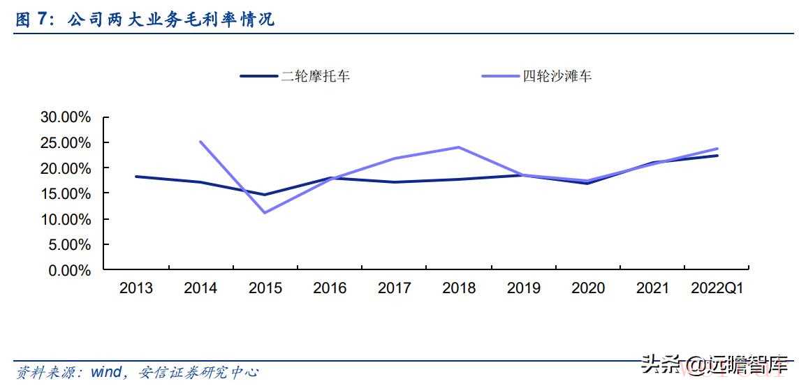 2019年-2021年,两轮越野摩托车的毛利率分别为18.67%、16.94%和21.11%,全地形车的毛利率分别为18.52%、17.36%和20.73%。时间线拉长来看,2013-2021年期间公司两类业务的毛利率均在20%上下波动。