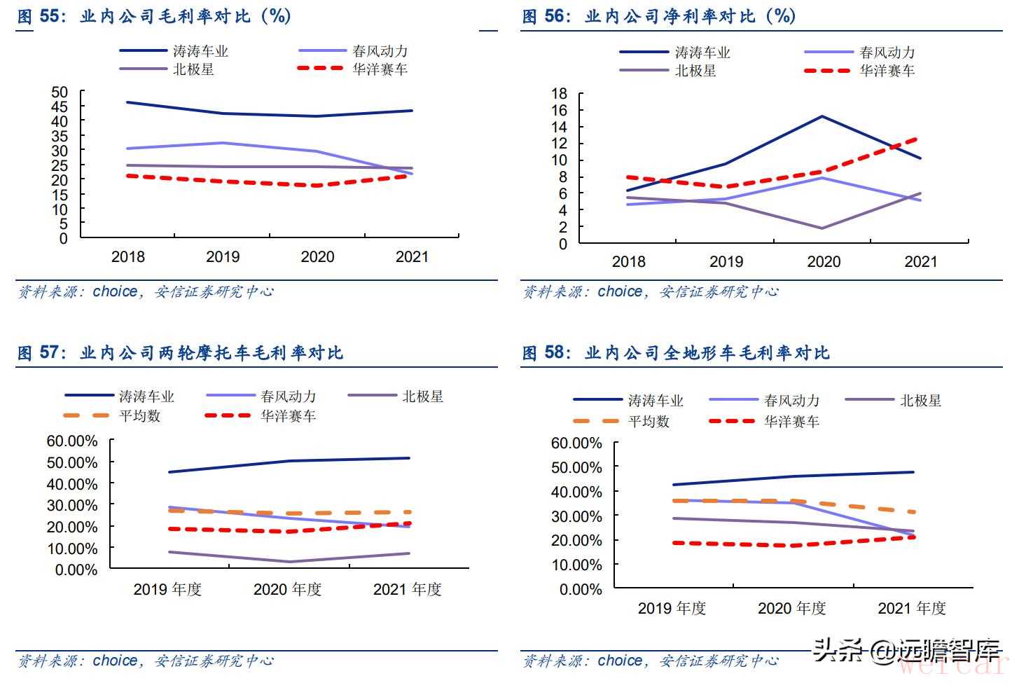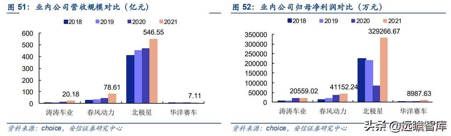 2018-2021年,涛涛车业、春风动力、北极星、华洋赛车的 3 年营收 CAGR 分别为48.47%、45.63%、10.49%、54.67%,3 年归母净利润 CAGR 分别73.95%、50.70%、13.79%、80.92%。