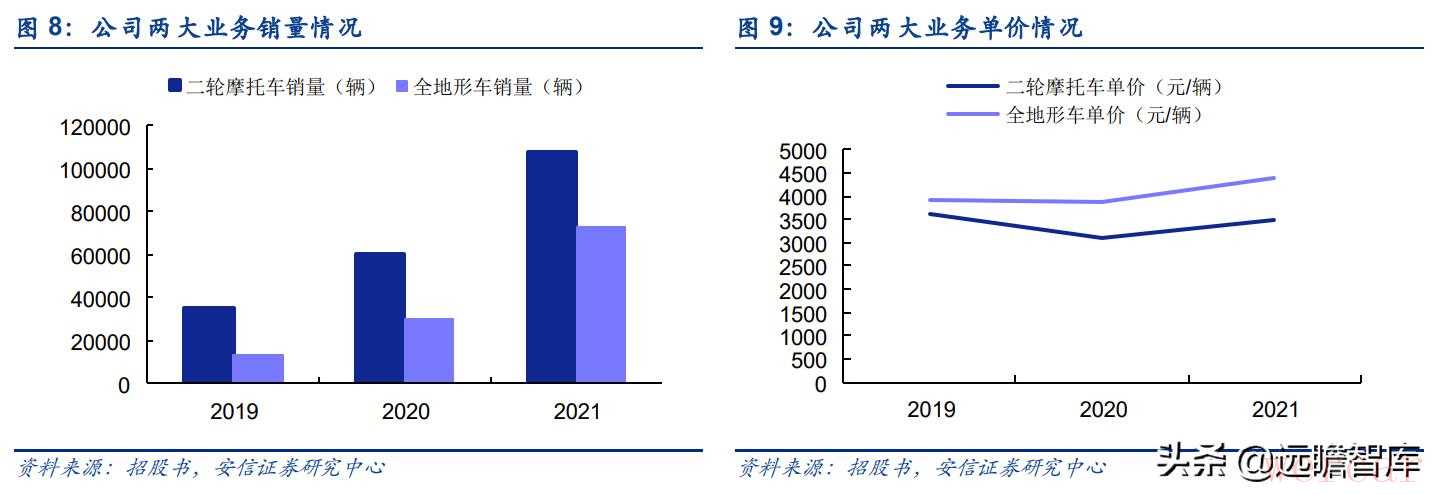 销售网点增加、品类拓展、品牌影响力提升推动业务持续壮大,2021年两大业务量价齐升。 相较于两轮越野摩托车,全地形车产品的单车价格更高,为公司营业收入提供了新的增长点。