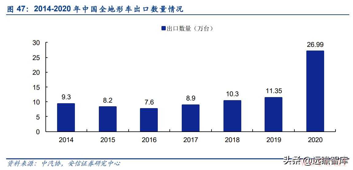 近年来,我国全地形车行业以出口为主,90%以上的全地形车都出口到北美、欧洲等区域。 出口数量来看,2014-2020年期间,我国全地形车出口数量由 9.3 万台增至 26.99 万台,2020 年受疫情催动,出口量同比增长 138%。